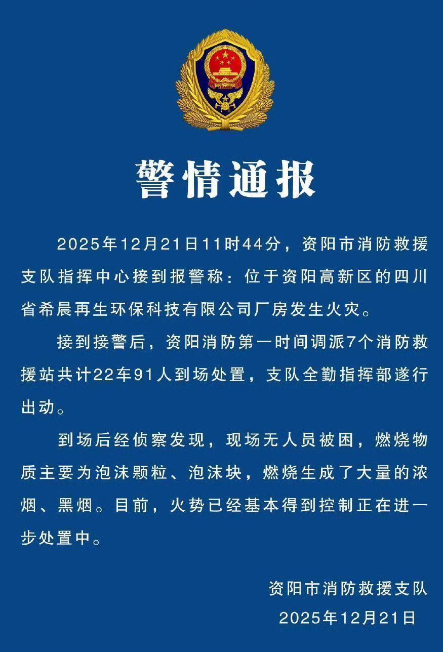 通报介绍,当天11时44分,资阳市消防救援支队指挥中心接到报警称,位于资阳高新区的四川省希晨再生环保科技有限公司厂房发生火灾。接到接警后,资阳消防第一时间调派7个消防救援站共计22车91人到场处置,支队全勤指挥部遂行出动。到场后经侦察发现,现场无人员被困,燃烧物质主要为泡沫颗粒,泡沫块,燃烧生成了大量的浓烟,黑烟。目前,火势已经基本得到控制正在进一步处置中。